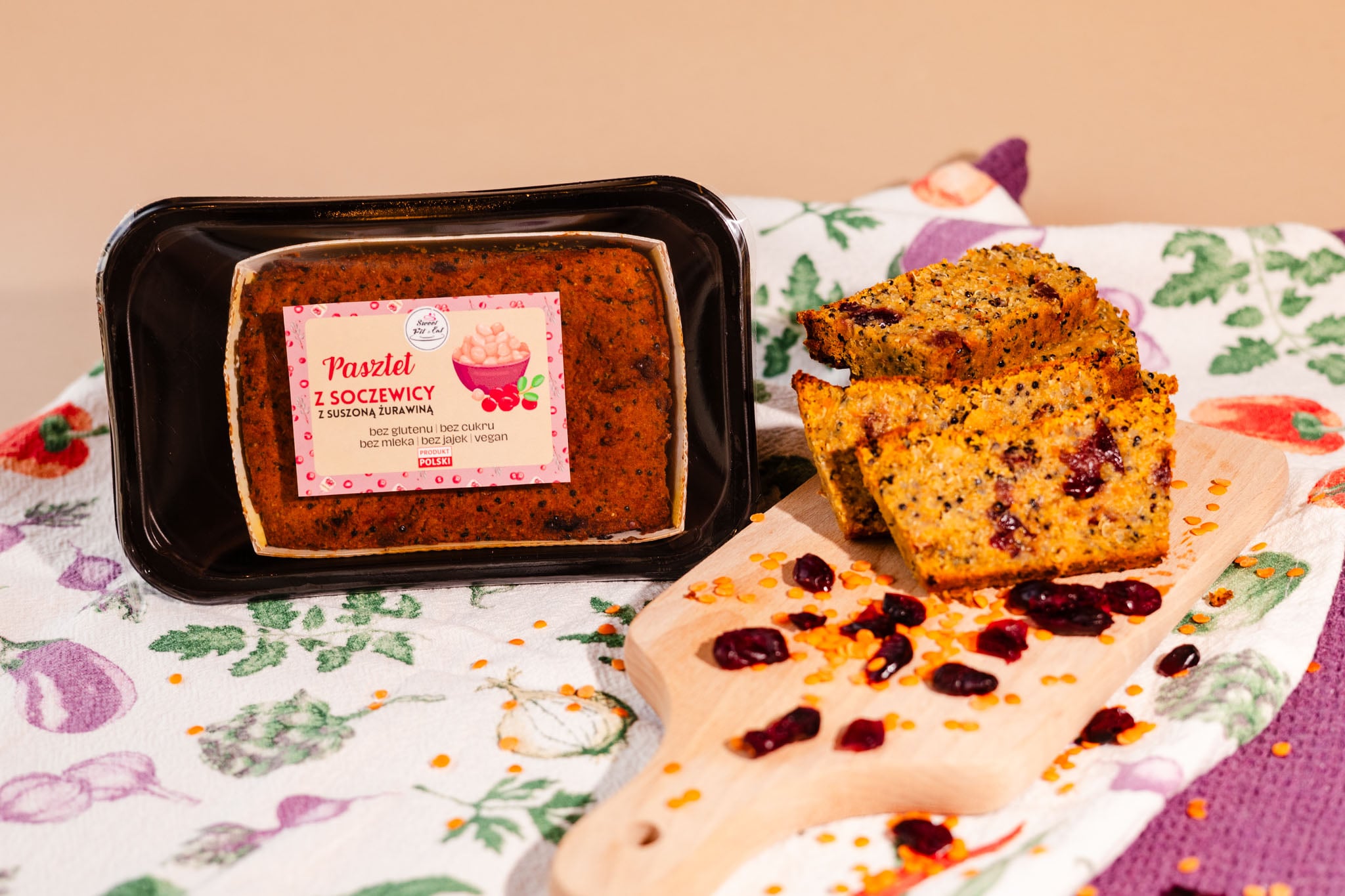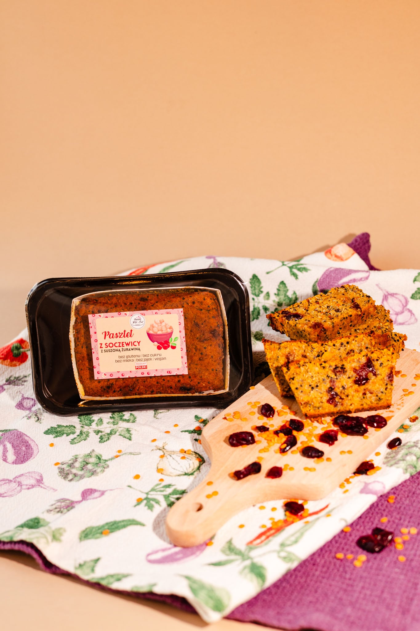 Składniki: czerwona soczewica, pieczarki, komosa ryżowa, ciecierzyca, suszona żurawina, marchew, cebula żółta, olej rzepakowy, czosnek, bezglutenowy sos sojowy (SOJA), przyprawy: sól, oregano, tymianek, pieprz czarny, ostra papryka.