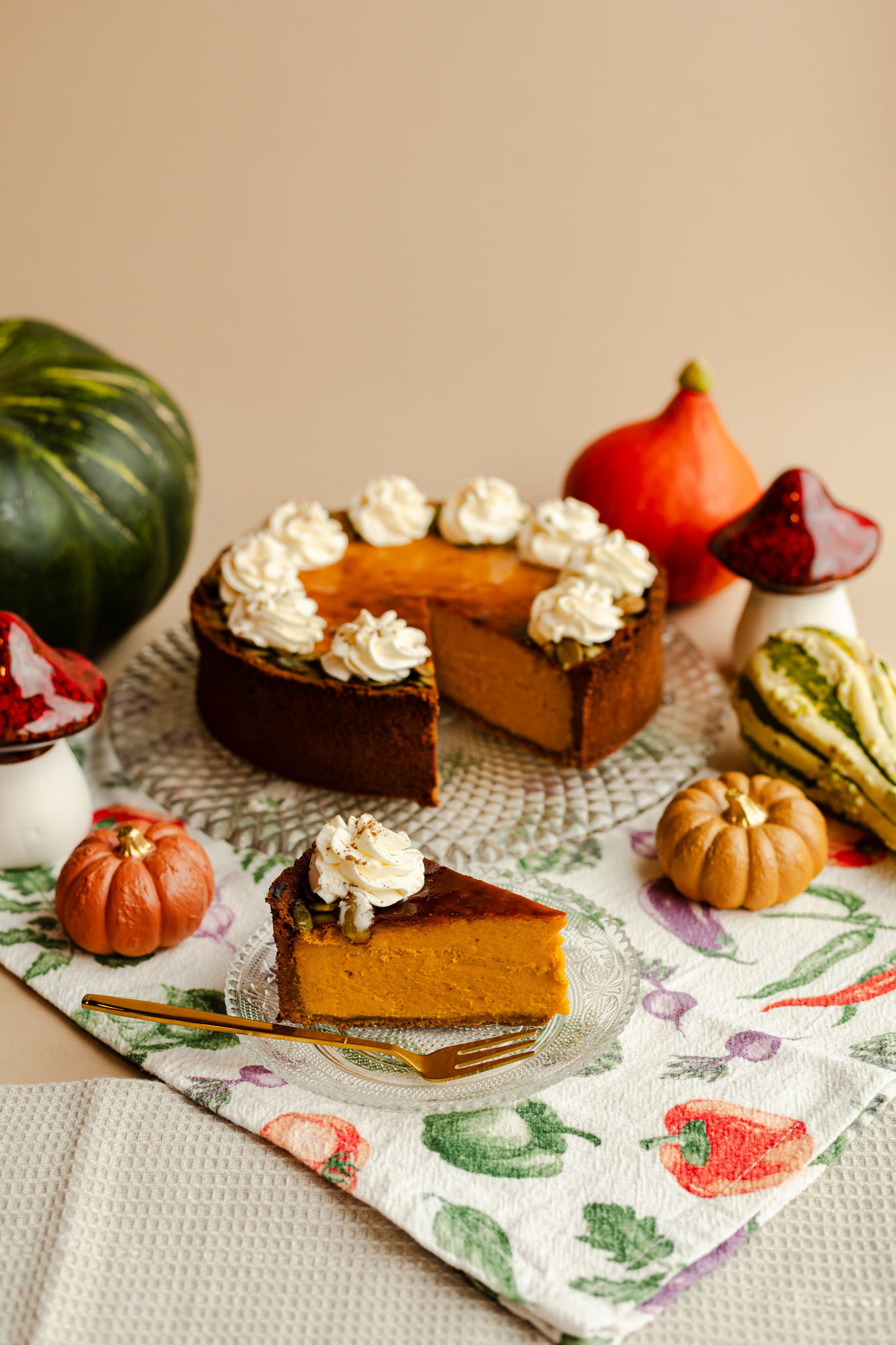 Składniki: dynia hokkaido, serek śmietankowy (MLEKO), substancja słodząca: erytrytol, JAJA, śmietanka (MLEKO), mąka ryżowa, masło (MLEKO), mąka owsiana, syrop z agawy, olej kokosowy, pestki dyni, skrobia ziemniaczana, cynamon, gałka muszkatołowa, imbir.